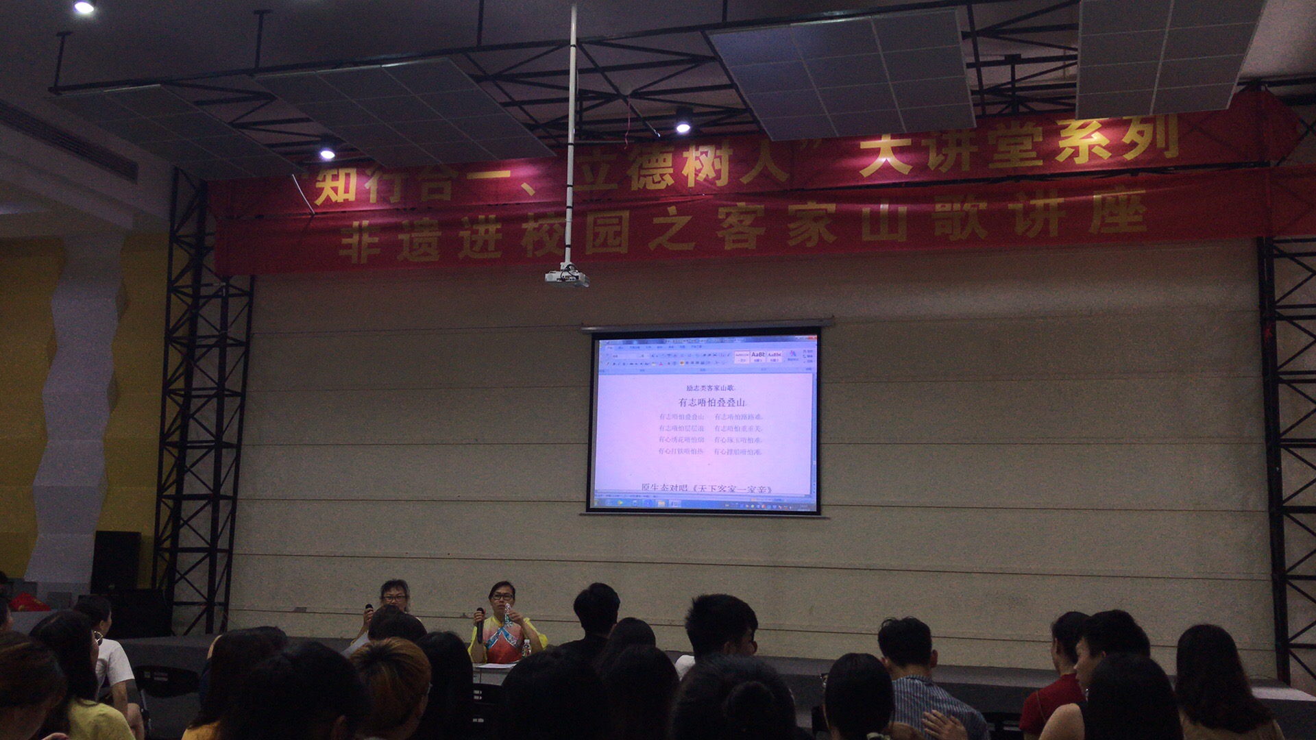 2018年7月5日,伟德国际1946在艺术楼演奏厅举办了“非遗进校园——客家山歌进校园”专题讲座活动。本次讲座的主讲人,是现任凤岗客家山歌协会会长刘桂芳老师以及凤岗镇非物质文化遗产客家山歌第三代传承人杨艳芬老师。