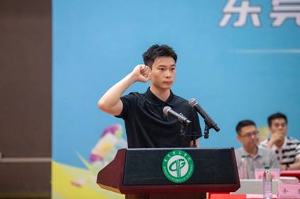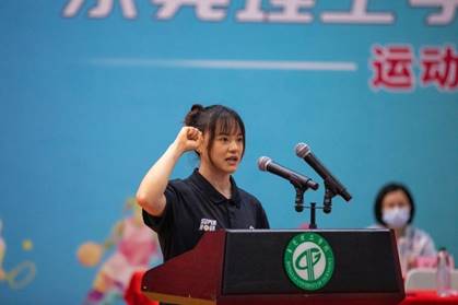 张越同学和王梓婷同学分别作为裁判员代表和运动员代表上台宣誓,承诺认真对待各项赛事,展现风采。