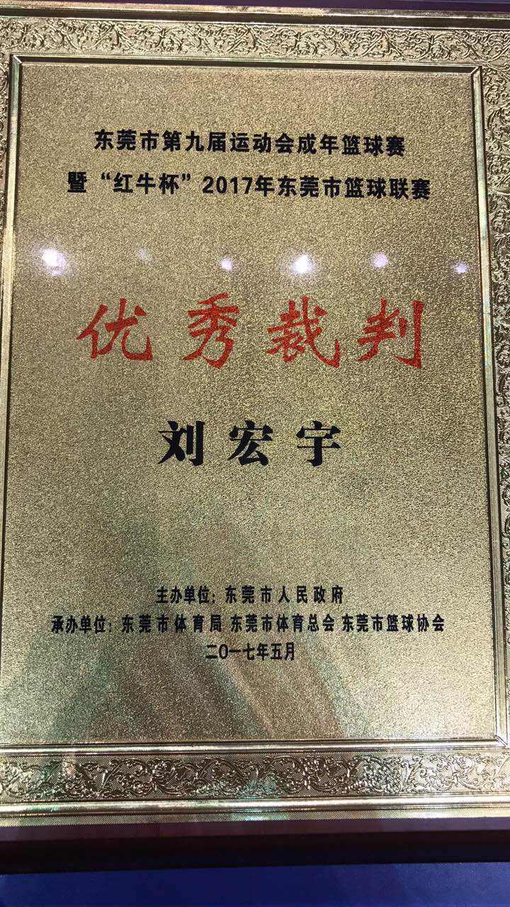 2017年5月16日,伟德国际1946刘宏宇、潘荣远两位老师荣获东莞市人民政府主办的“2017年东莞市全运会暨东莞篮球联赛”优秀裁判员称号。