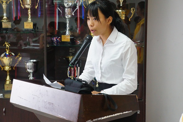 冯炎红老师为极限飞盘获奖队伍颁奖