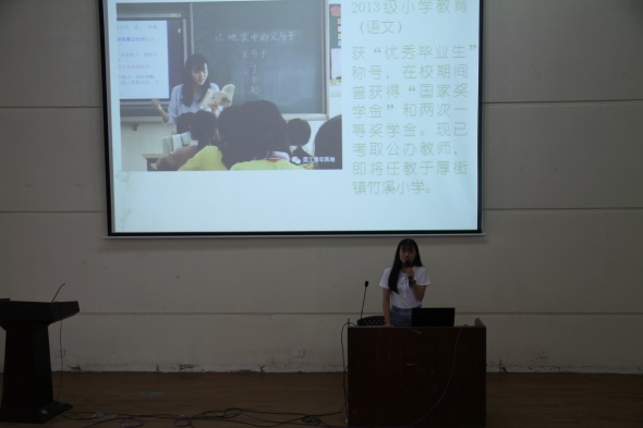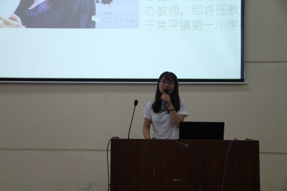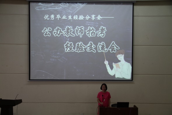 紧接着,梁婷师姐为我们介绍了她的备考经历,并用自身的事例告诉要参加公办教师招考的师弟师妹们要尽早的开始复习,并进行系统的知识梳理,还要反复多次复习总结。同时,她也提醒将来参加公办教师招考的师弟师妹们:气场很重要,要多利用上台的机会磨练自己。