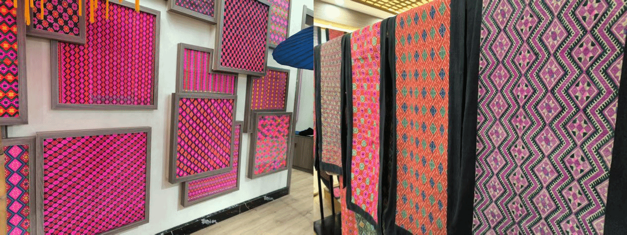 第三天上午同学们来到位于福堂镇的壮族织染技艺传承基地——壮锦博物馆,开启了一场沉浸式的民族文化体验之旅。负责人详细讲解了壮族和瑶族婚礼服饰的历史渊源与独特工艺。精美的绣片、繁复的银饰,每一件展品都诉说着民族婚俗的深厚底蕴。壮锦的绚丽世界令人叹为观止。在壮锦传承人的指导下,采风团成员近距离观察了壮锦的织造过程,了解到菱形纹、回字纹等传统纹样背后“一举高中”和“喜从天降"的美好寓意。