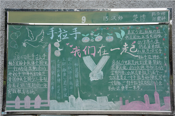 在本次的黑板报展演中,同学们用心地画好一幅幅黑板报,提升了师范生的基本功,同时,通过本次的黑板报展演,同学们了解到了有关“手拉手”活动的有关信息。开展“手拉手”活动,是响应党组织号召的实际行动,同时也是加强自身思想道德建设的一项重要措施,因此,我们应积极参与到“手牵手”活动中,时刻心系小伙伴,珍惜现在来之不易的生活。