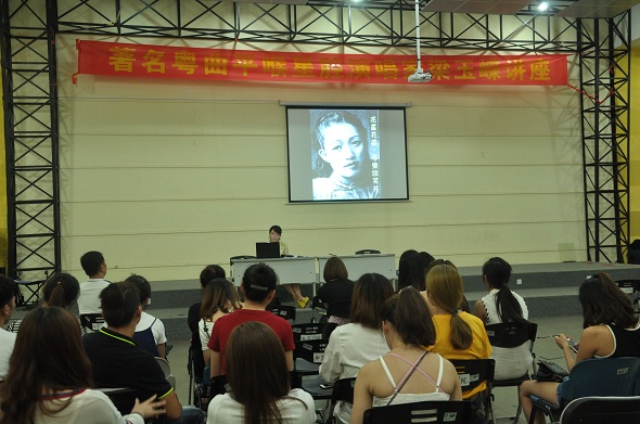 梁玉嵘老师主要通过三部分内容来讲解粤曲的探索与发展。第一部分是粤曲的发展历程,让同学们初步了解粤曲。第二部分从粤曲的角色与唱腔,梁老师还现场示范了粤曲的不同唱腔,引来同学们无数的赞叹。第三部分则是从粤曲的形式与发展,强调粤曲是兼容并蓄的。在现场,梁老师献唱一曲《牡丹亭》,获得了同学们雷鸣般的掌声。最后,梁老师高歌一曲,送给同学们,也象征报告会的结束。