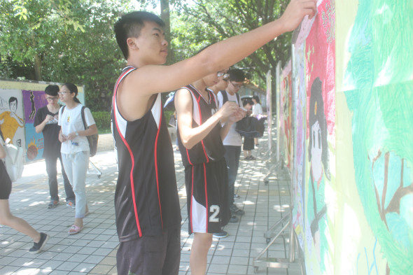 许许多多的同学都慕名前来,手拿着工作人员提供的贴纸,走到自己心仪的手绘海报前贴上宝贵的一票,有的投完票后还不忘慢慢欣赏一番,发出一声声真诚的赞美。现场氛围热闹非凡,无一不在为惟妙惟肖的画风和高超娴熟的技术而赞叹。在一番番投票较量后,终于在众多的手绘海报中评选出了所得票数最高的“十佳手绘海报”。