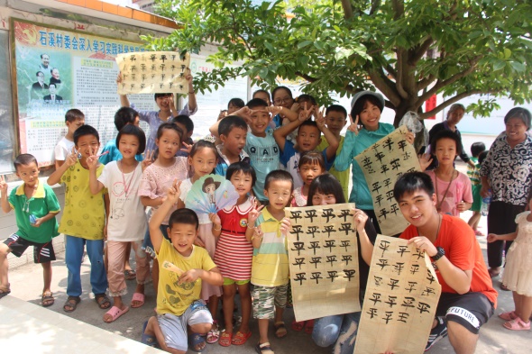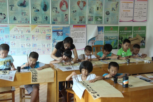 服务队同学们给孩子们上书法课