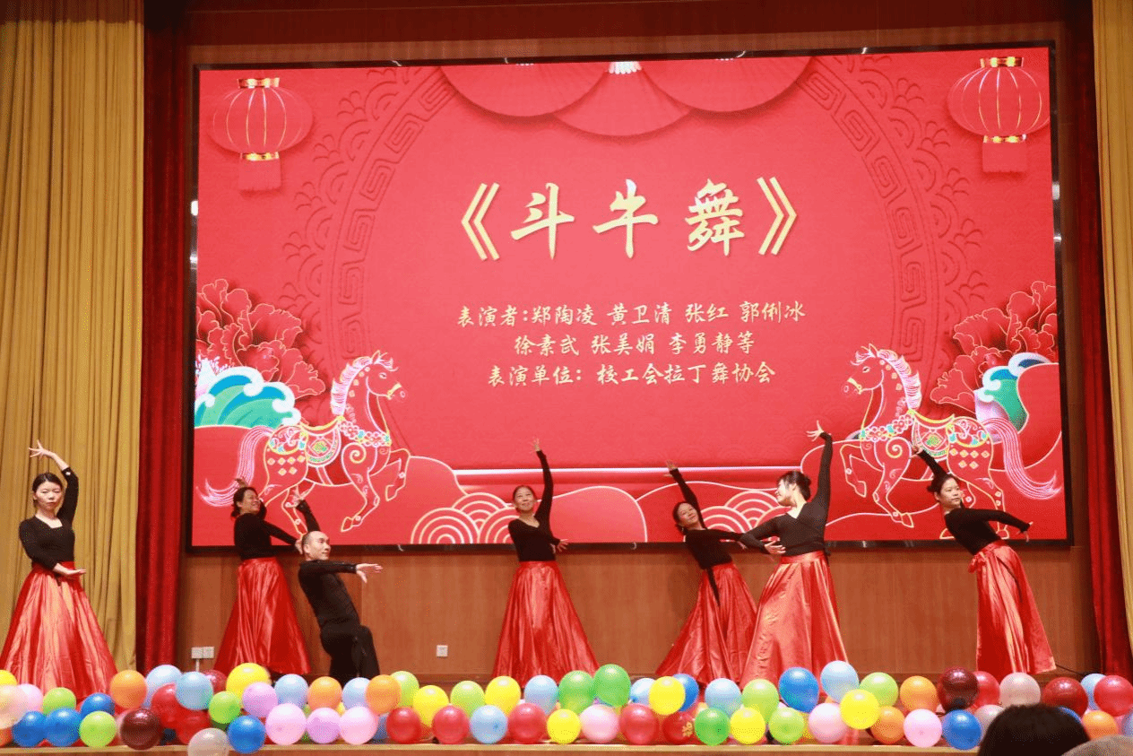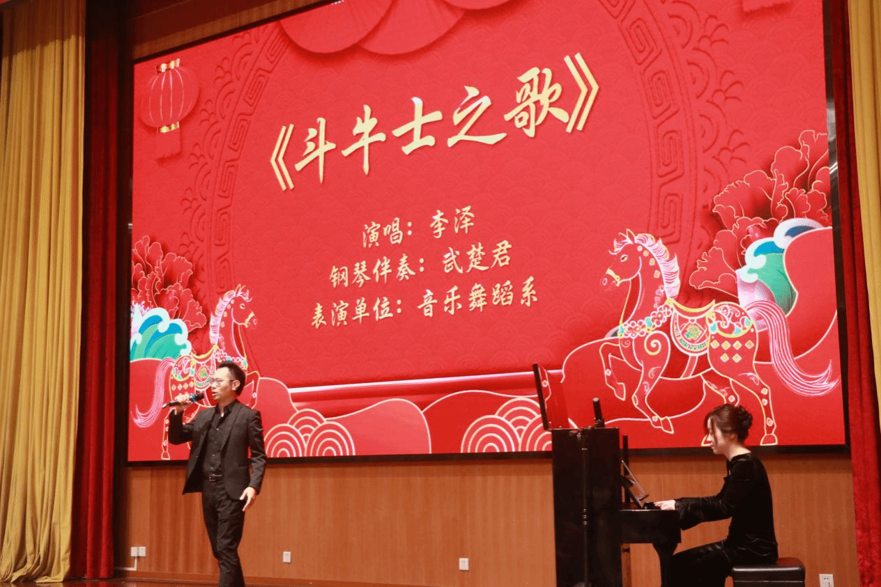 歌》,用深情诠释教育初心;音乐舞蹈系的男声独唱《斗牛士之歌》、长笛独奏《康康舞曲》展现扎实艺术功底;校工会拉丁舞社团的《斗牛舞》热情奔放,点燃现场气氛;教育系教师的歌曲串烧《策马奔腾跑调串烧》创意十足,引得全场欢笑;朗诵《古今中外贺新春》以古今交融的表达传递新春喜悦,歌舞《筑梦中国》则以恢弘气势为表演画上圆满句号。