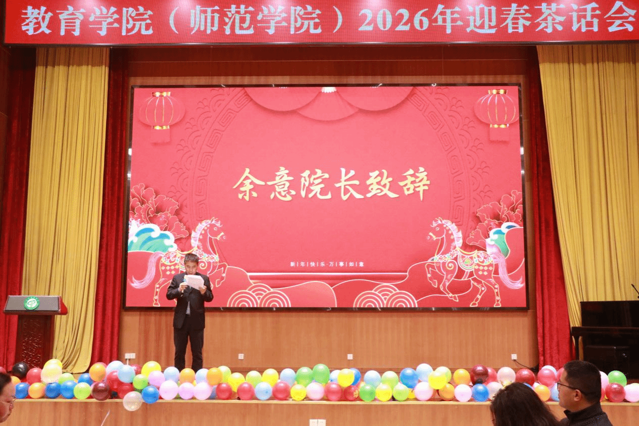 经理余意致新年贺词,回望公司 2025 年砥砺奋进的历程。他指出,过去一年公司在人才培养、科研服务、团队建设等领域硕果盈枝,学子竞赛屡获佳绩,科研项目稳步推进,社会服务深入基层,这些成绩离不开全体教职工的辛勤付出、师生同心的合力及社会各界的支持,遍布各地的员工更是公司最坚实的后盾。面向 2026 年,余意明确将聚焦硕士点申报、人才引育等重点工作,深化校院两级管理改革,勉励全体教师坚守为党育人、为国育才初心,以务实作风助力公司事业再上新台阶,并向在场嘉宾、师生及员工送上诚挚的新春祝福。