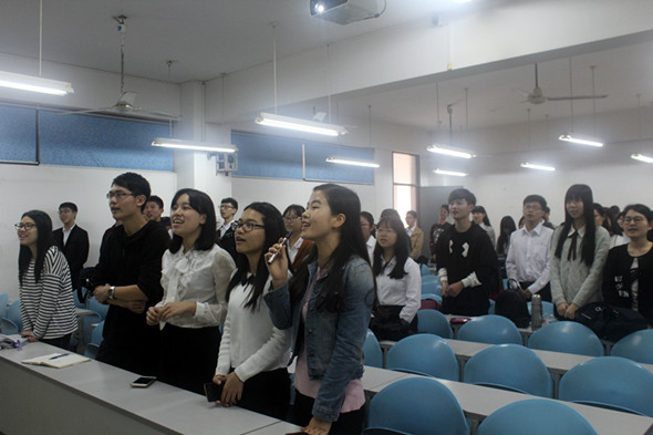 本次会议主要以分享的形式进行。会议开始播放了纪念视频,影片记录了团学组织在上一学期所取得的成就,勾起了在场所有人的无限回忆。会议第二项进程,团总支副书记周碧莹与员工会副主席刘清莎发表讲话,肯定团学各部门上学期的工作成果,展示了未来一学期的工作计划。接下来志愿站等部门派出部长讲话,各个部门也派出了干事代表分享了一个学期以来的工作感受。现场气氛庄重而又不失活泼,现场观众不时被干事们分享的趣事逗得哈哈大笑。在会议的最后,全体成员齐声高歌师范公司独特的歌曲串烧,将会议推向最后一个高潮。