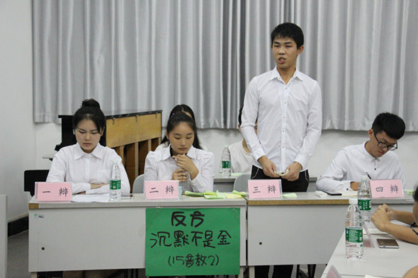 这场辩论赛的正方14级小教理,反方15级音教2班就观点“沉默是金/沉默不是金”这一辩题进行辩论,两方都为自己的观点进行辩论,辩论赛进行得热火朝天。在比赛结果宣布之前,评委对两方进行了点评,还进行了辩手与观众的互动环节。最后宣布胜利的是正方14级小教理,反方四辩凌文浩获得“最佳辩手”称号。