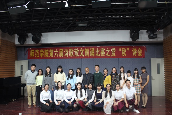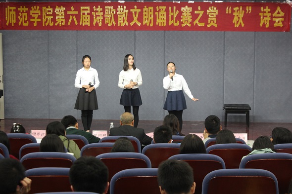 11月27号下午,师范公司在莞城校区小剧场举办了第六届诗歌散文朗诵比赛之赏“秋”诗会。出席本次比赛的有师范公司梁兴源副教授、伦丽青老师、袁志军老师、谢伟红老师、莞城校区理阳阳老师以及师范公司2015级全体新生。