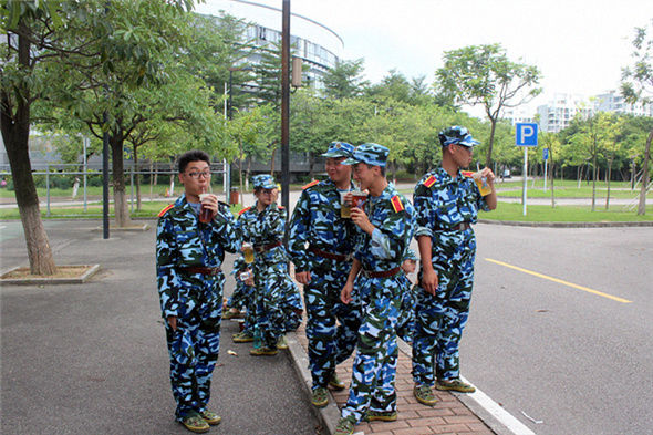 下午,师范公司团总支、员工会各部门拿着一箱又一箱的饮料到达训练场地篮球场,有秩序地做好饮料派发的准备工作。军训休息期间,在干部们的带领下,同学们按照各排顺序,自觉排队来到饮料派发点,领取清凉解渴的茶。冰冷清润的饮料,为同学们带来了这个炎热午后的一片清凉。同学们喝着糖水,交谈甚欢,干部们脸上都露出了欢喜的笑脸,现场气氛十分温馨。特别是,袁老师带着同学们喊“加油!师范公司”的时候,满满的力量渗透在字里行间。冰凉透心的饮料却是包含着团学家庭对同学们炽热的爱。