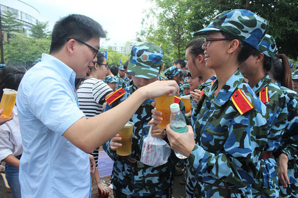 2014年9月14日,师范公司辅导员袁志军老师和团总支、员工会的干部给正在艰苦训练的2014级的同学们送去爱心饮料,清凉的饮料为军训中的同学们驱散了一丝的疲惫与热气。