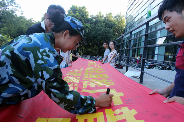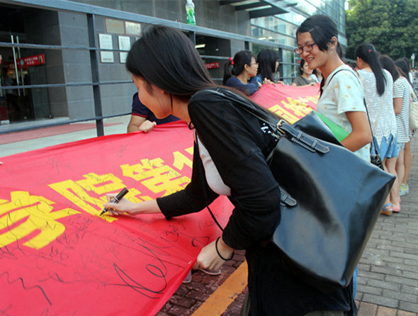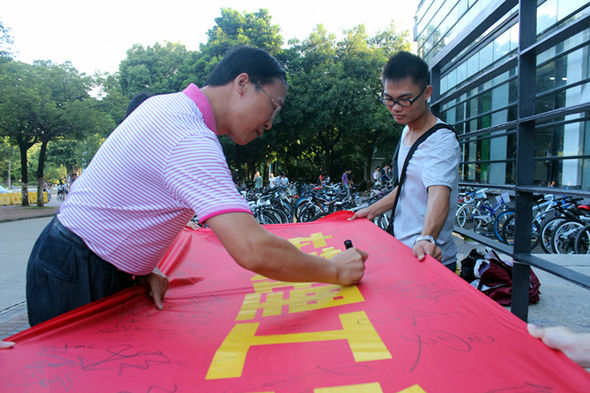 签名活动开展得十分顺利,慢慢地,横幅上已是满满的签名了。可是,同学们的热情依然非常高涨,还有军训刚刚结束的大一新生们都纷纷在横幅上写上了自己的名字。