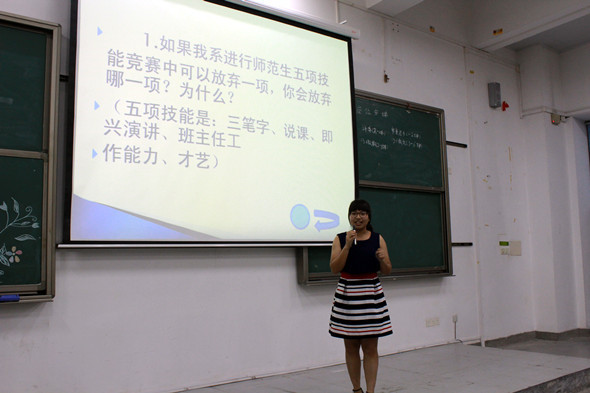 为了提高师范生的演讲能力,2014年4月27日晚上,师范公司在教学楼6E306教室举行了第五届师范生基本功展演“中文演讲比赛”。出席比赛的老师有师范公司郑陶凌老师、张郿老师。师范公司的全体员工观看了比赛。