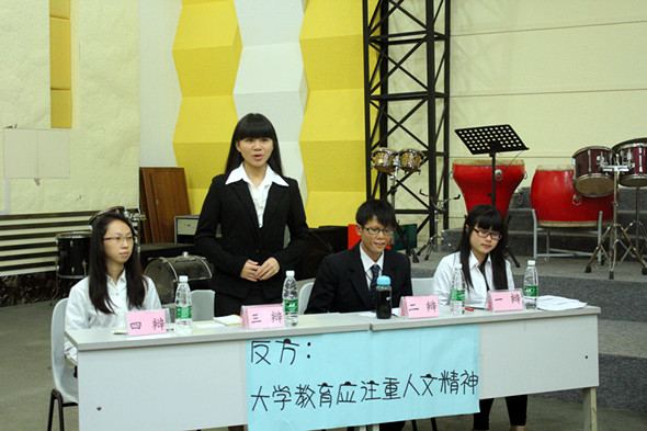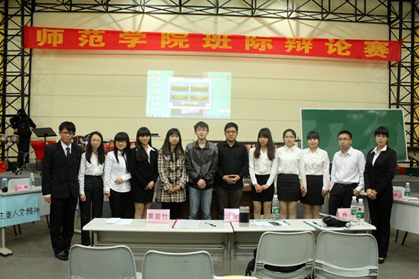 2014年3月9日晚,师范公司演奏厅内热闹非凡,师范公司班际辩论赛的决赛在此举行。比赛由13级小学教育理科班(正方)对战12级小学教育文科班(反方),双方以“大学教育应该注重科学精神”和“大学教育应该注重人文精神”为主题展开辩论。本次比赛邀请了校辩论队队长张亦康师兄、政法公司辩论队队长章若竹师兄和师范公司辩论队队长林娟师姐担任评委。