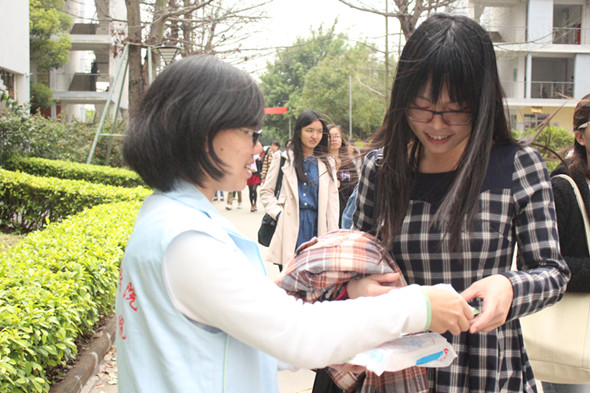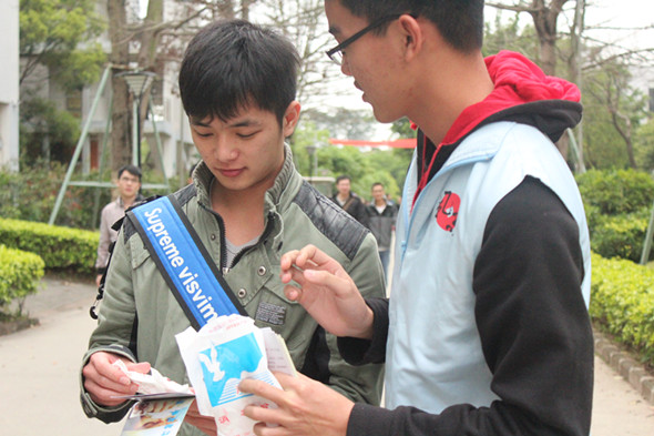 志愿者们各自在校道上向过往的人们派送传单,提醒注意预防H7N9禽流感。通过派发各类传单,呼吁人们平常要注意饮食卫生以及告知人们该如何防范感染禽流感的传播,以防止禽流感疫情更进一步地恶化。除此之外,还配发了消毒粉,让大家可以加强日常消毒,减少发病机率。更有几位同学询问正确使用消毒粉的方法和可用之处,避免错误使用而导致不良后果,对此志愿者都一一地进行了解答以及耐心地解释,引导同学们更好地预防禽流感。