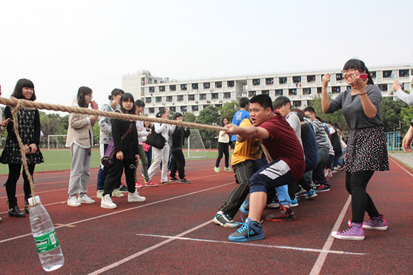 主持人进行开场白后,同学们进行热身运动,接着就是举行激动人心的拔河比赛。拔河比赛由12级的同学对战13级的同学,同学们都拼尽全力,咬紧牙关,赛况激烈,在旁助威的啦啦队也为之呐喊。以班为单位的团队小游戏“铁人三项大接力”紧接其后,先是派出人员合作夹球绕物,然后就是跳绳接力,最后,完成的队伍派出一名人员奔向终点,裁判全程计时,最先完成的队伍为胜。同学们都沉浸在运动的快乐之中。