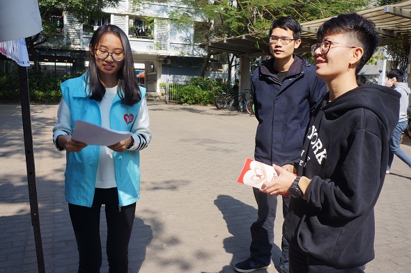 冬日阳光温暖明媚,工作人员积极认真地悬挂宣传横幅,散发宣传资料,吸引了不少路过的同学们前来参与预防艾滋病知识问答游戏。现场气氛热闹,欢声笑语,同学们在愉快玩游戏的过程中,也潜移默化地学到了许多关于预防艾滋病的知识。