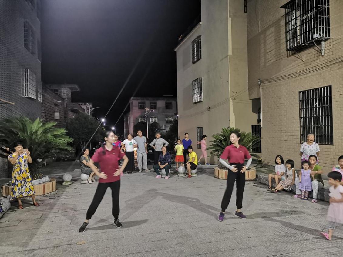 同时,暖风义教队还给当地群众宣讲国家资助和助学贷款政策,通过村里定点摆摊、走访贫困户等形式,扩老员工资助政策的影响范围。除了调研活动,暖风义教队开展了三次文化惠民活动。文化惠民分为两部分,一部分是播放红色纪录片或电影,一部分是由队伍里的舞蹈老师带领当地妇女一起跳广场舞。文化惠民活动受到了村民的欢迎,当地的村委也对该活动表示了肯定,并带头参与到了此项活动中来,气氛融洽。