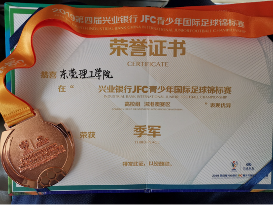 本学期初,公司足球队利用周末时间赴深圳龙岗参加了2019年JFC青少年国际足球锦标赛。赛前,足球队师生就在暑假期间提前回校集训。功夫不负有心人,公司足球队分别在小组赛以1-0绝杀深职院一队,3-0完胜港校联队,3-1战胜广东医科大学,以小组赛三连胜昂首出线,八强赛3-0完胜香港大学PGSA进入半决赛,半决赛0-2不敌卫冕冠军澳门大学,最终进入三四名决赛,在三四名决赛中以3-0完胜深职院二队,获得本届赛事季军。