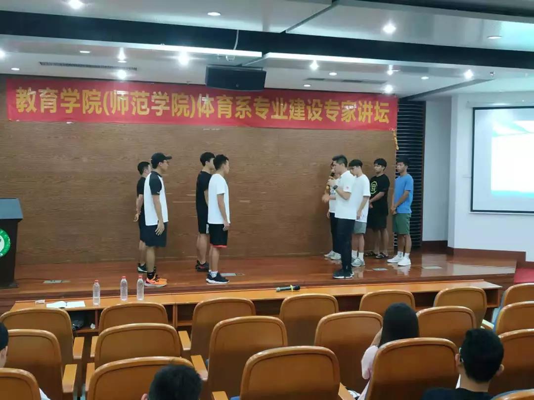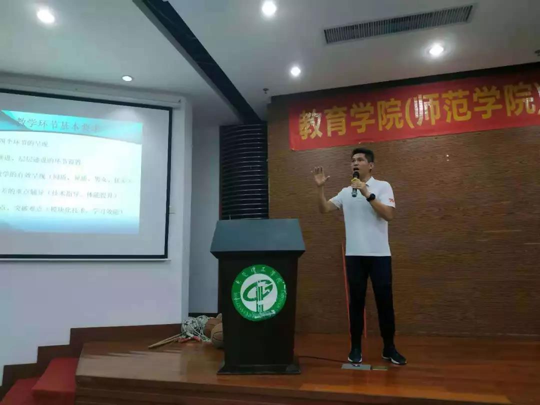 9月12日在学术交流中心,公司邀请东莞市体育教学名师,虎门东方小学教导处副主任聂武老师给体育系2016级和2017级的同学们做《中小学体育与健康学科片段教学组织与实施》的讲座。