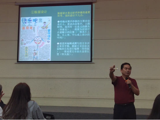 讲座中,吴东涛教授着重讲述了如何设计、制作黑板报和手抄报这一问题,并从准备步骤、组织工作的原则、手抄报的格式、美化与色彩、版面设计、排版,以及老员工与小员工手抄报的区别等方面进行深度剖析。