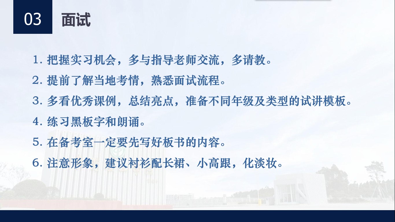 其次面试时要注重给予考官的“面缘”,注重衣着教态,普通话,粉笔字以及突显自我特长。