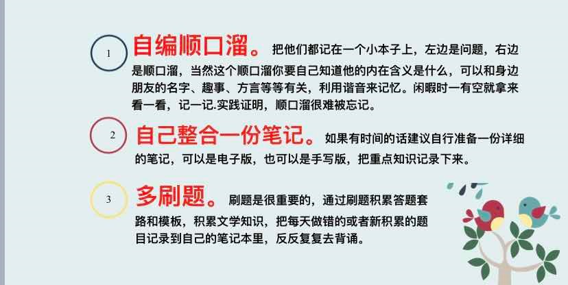 1.自编顺口溜。对文科知识不敏感的人,可以通过顺口溜的方式来逼迫自己记忆,顺口溜可以和身边朋友的名字、趣事、方言等等有关,利用谐音来记忆。