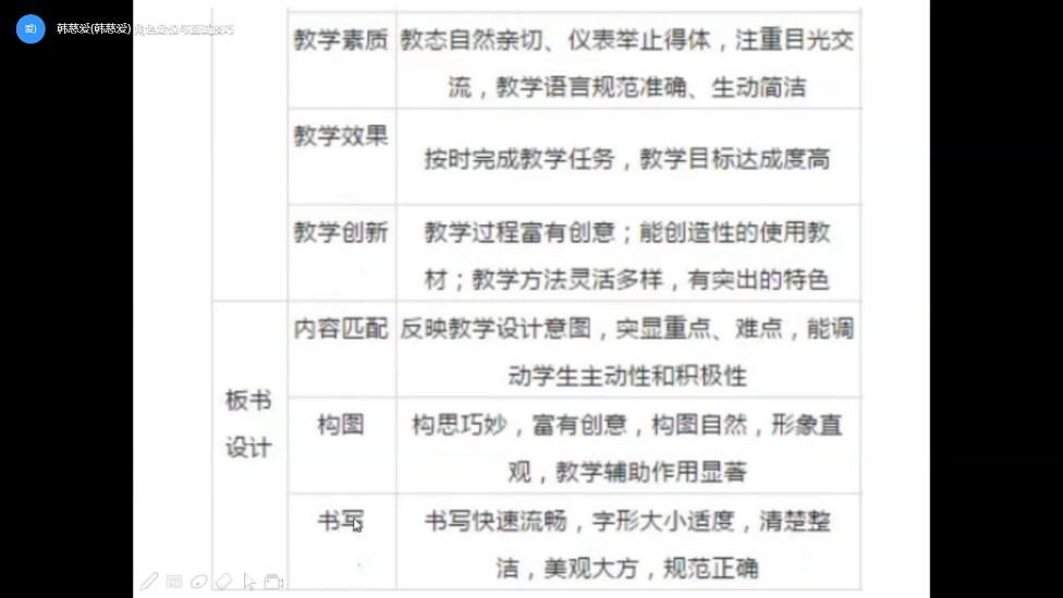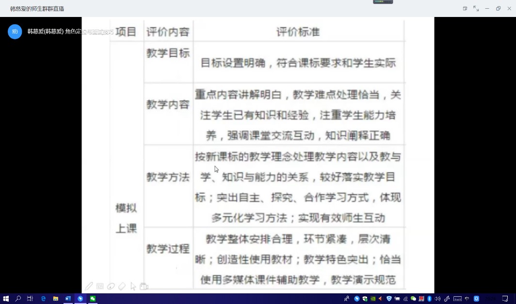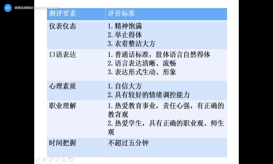 首先,韩老师从考官的视角告诉同学们面试者需要具备的综合素质,强调书写正确、试讲内容创新有效及多才多艺的重要性。随后,她从自我介绍、片段试讲及说课三个方面为同学们介绍了小学教师岗位面试的技巧。韩老师为同学们展示了某镇街对上述三方面内容的评分标准,并分别提出了一些小技巧。她表示,自我介绍的最佳时长为四分至四分三十秒,在这个过程中,肢体语言、图文并茂及现场展示等让自我介绍更快速直观的表现都是加分项。而试讲与说课的最佳时长皆为九分钟,她提醒同学们需正确的区分说课与试讲。两者在讲课时都要自然得体、要注意与“员工之间”的目光交流,板书与课件设计也要正确、精简。然后,韩老师在注意事项中提出了一些线上面试需要注意的问题,并强调了拍摄角度、视频剪辑及视频检查三个问题。