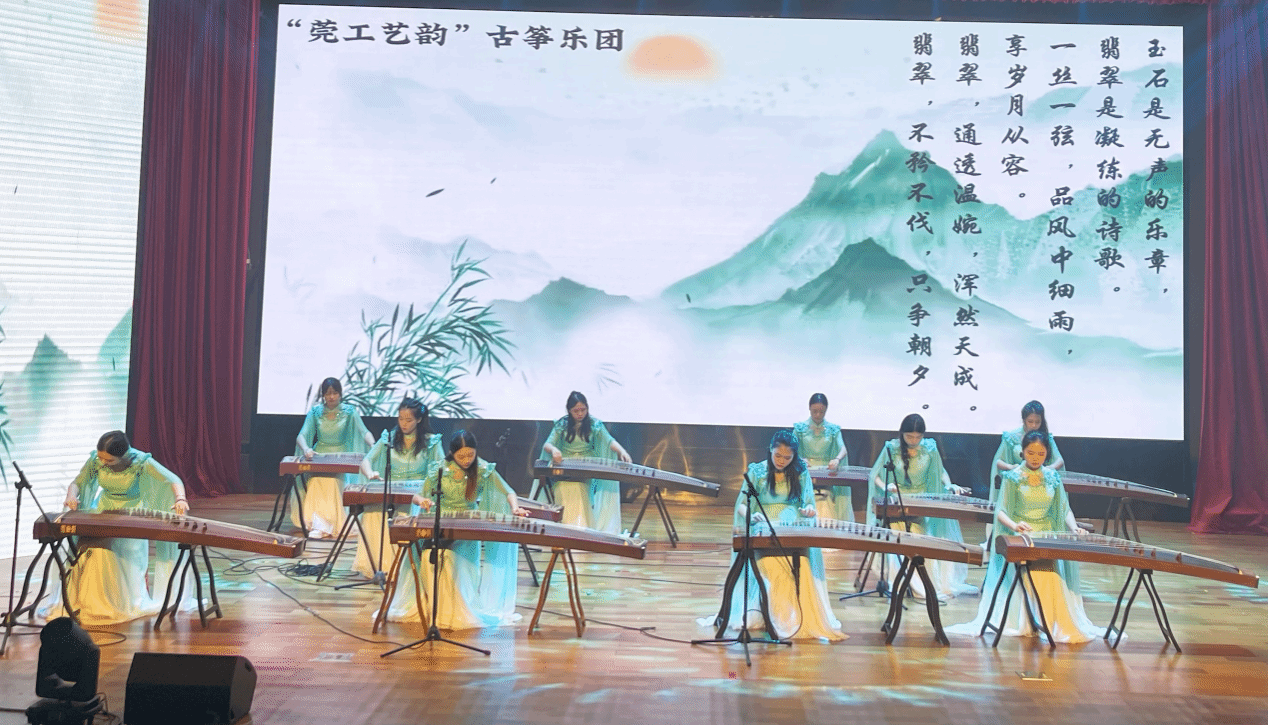 演出在“莞工艺韵”艺术团急徐有秩的《鼓诗》中拉开帷幕,大朗镇中心小学一年级舞蹈队带来的《七卜咙咚呛》亦极具地方特色,孩子们模仿鲁西北老爷爷制鼓、打鼓的节奏,承载着最纯朴的中国梦。“莞工艺韵”古筝乐团的重奏《翡翠》,曲风清新动感、韵律十足,展现出莞工学子温润如玉、玉汝于成的优秀品质。中心小学师生带来的民乐合奏《醒狮·龙舟》曲调热烈活泼,代表着新时代少年昂扬向上、奋发进取的不懈追求。“莞工艺韵”舞蹈团的原创舞蹈《玉兰颂》以东莞市花白玉兰为创作灵感,展现出莞工人敢于开路冲锋、砥砺前行的精神面貌。歌曲《萱草花》《踩到猫了》《我们有个梦想叫青春》《绒花》《小池》《Siyahamba》,或洋溢着纯真的童趣,或充斥着青春的激情,或诉说着隽永的记忆,引人入胜。中心小学带来的舞蹈《十八洞夏令营》,生动演绎出城里小朋友和苗族小朋友载歌载舞的欢乐场景,形式新颖,活力四射。最后,演出在“莞工艺韵”艺术团的歌伴舞《筑梦中国》大气磅礴的旋律中落下帷幕。