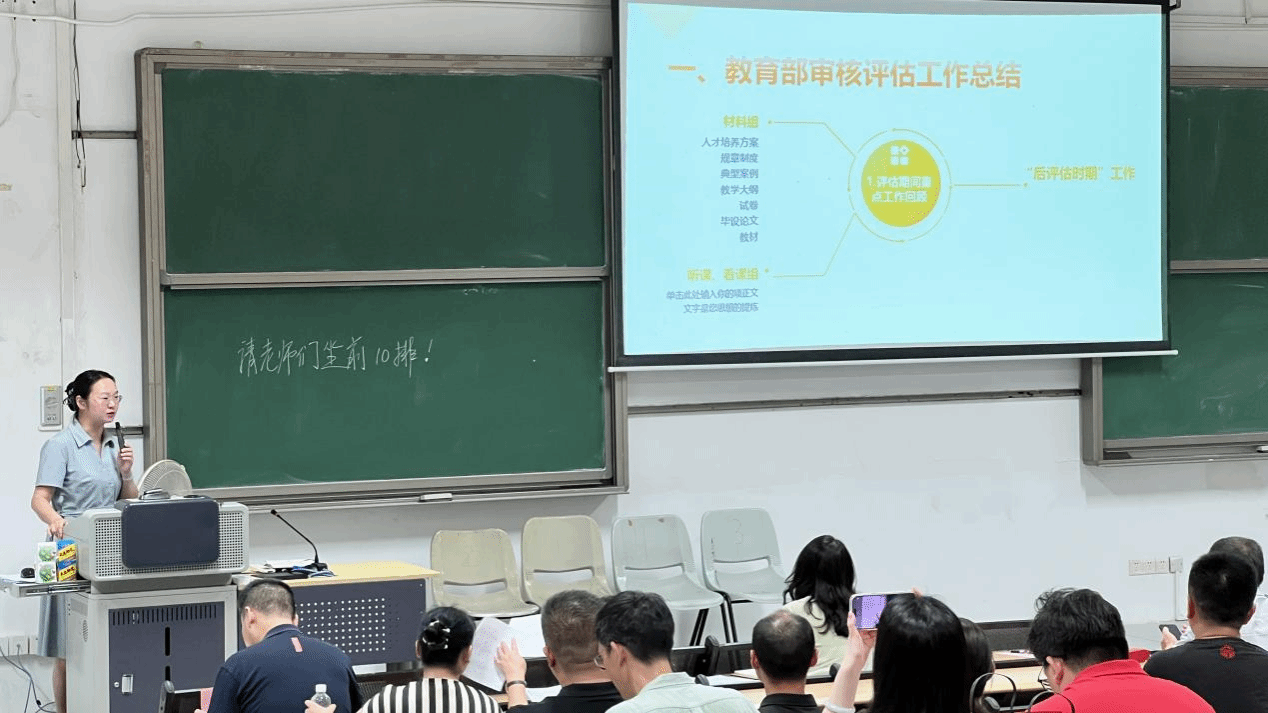 黄琼副经理对评估工作进行了全面的总结,并对期末教学工作提出了具体的要求。她回顾了在教育部审核评估期间的关键任务,涵盖了从材料准备到课堂教学的各个环节,并对人才培养方案、规章制度、典型案例、教学大纲、试卷、毕业论文、教材等方面的完成情况进行了详细的梳理。她强调,教学工作的改进是一个持续不断与时俱进的过程,需要全体教师不懈努力和创新投入,在后评估时期,老师们要继续加强课堂管理,不断提高教学质量,确保教学过程规范,创造更多教学教研成果。关于期末教学工作方面,黄琼副经理主要阐述了课程目标达成度的分析、成绩的提交以及教学档案材料的归档等事项,同时鼓励所有教师利用暑假时间,加强个人专业知识学习和教学技能提升,积极参与教研教改活动,以及各种教学竞赛,以此促进教学水平的整体提高。