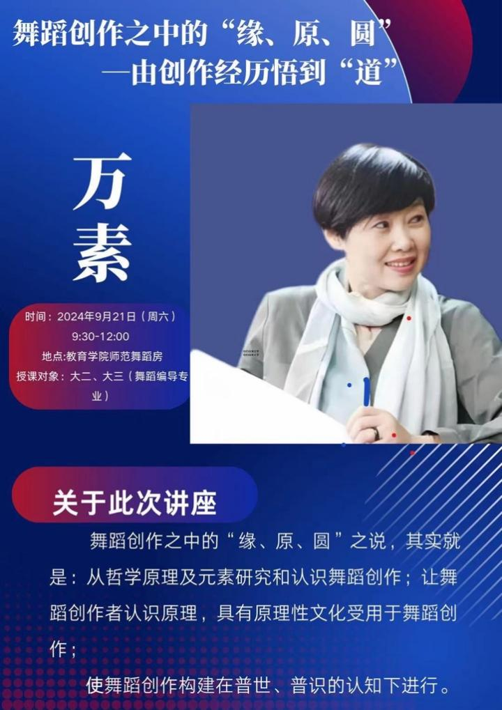 2024年9月21日,万教授面向2022级、2023级舞蹈编导专业员工,及舞蹈教研室全体专任教师开展主题为《舞蹈创作中的“缘、原、圆”——由创作经历悟“道”》专题讲座。