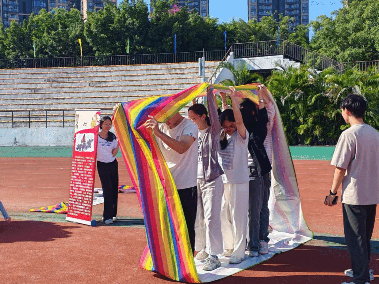 在“巧渡金沙江”闯关点,要利用有限的砖块,在最短的时间内,让全组队员到达终点。过程中,各小组充分发挥队员们的聪明才智,展现了集体团结协作,英勇奋进的精神风貌。