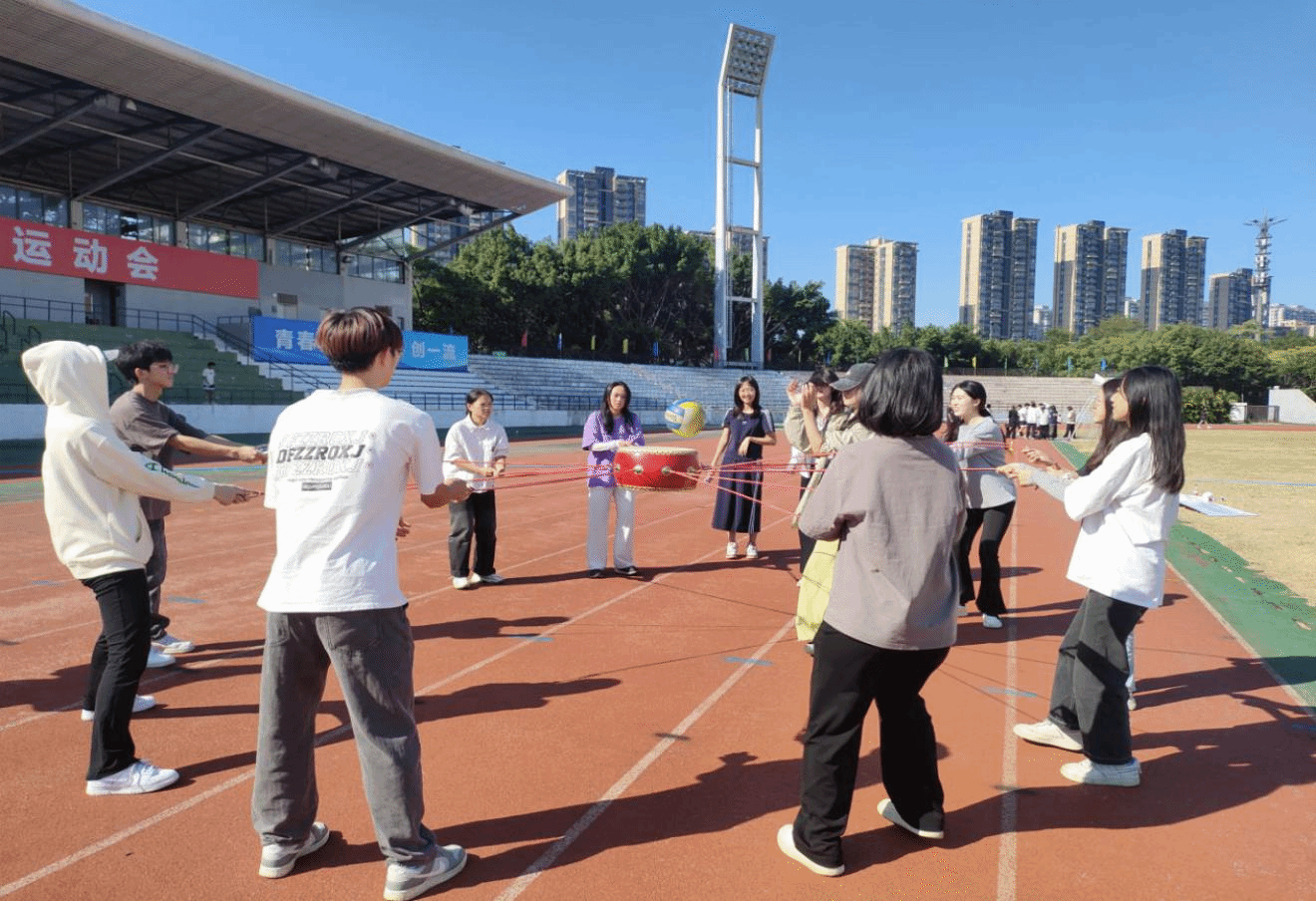在“大会师”闯关点,各组队员需要齐心协力,共同合作,在一分钟内尽量多的用同心鼓击起排球。在击球的过程中,参赛队员始终保持注意力集中,随球落的位置,不断调整方位和力量,在其它队员的加油打气声中,顺利完成一分钟击球。游戏结束一刻,大家欢呼雀跃,深切感受到红军经过一万五千里长征,克服各种困难,最终胜利会师的喜悦。