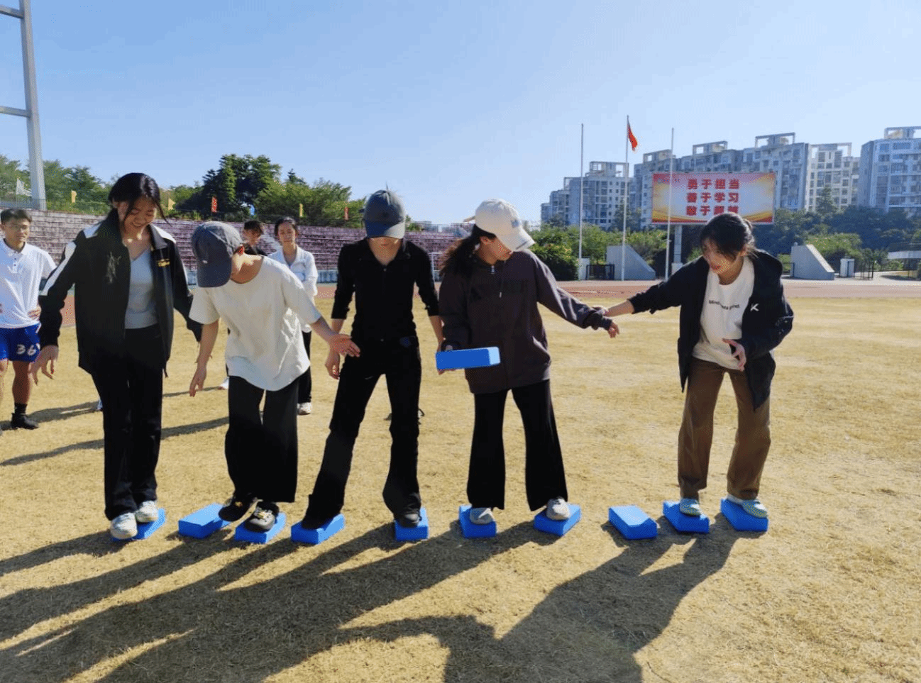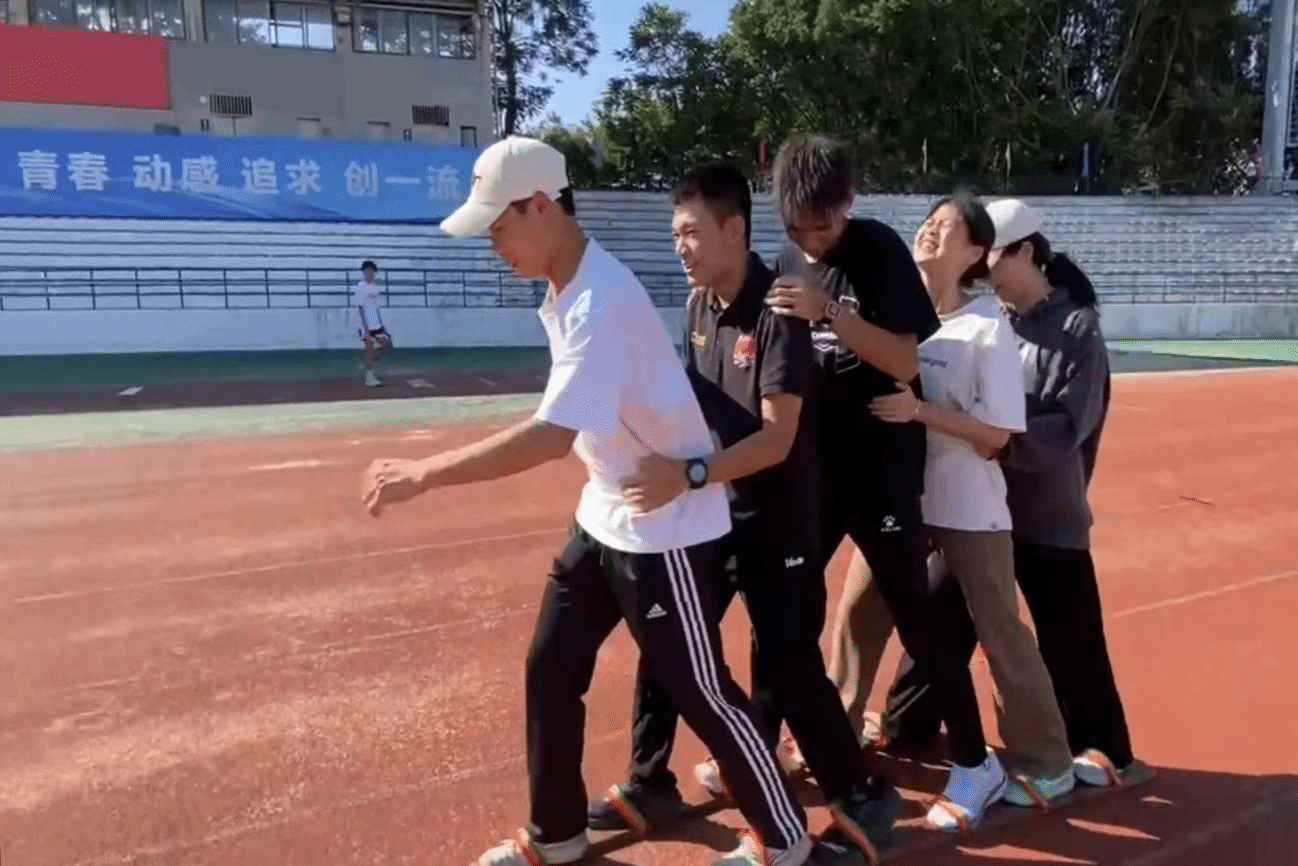 在“过草地”闯关点,队员们努力协调步伐,高声齐喊“一二、一二”,咬紧牙关以最快的速度向终点冲去。在加油声中,大家充分体会到步伐一致,齐心协力的重要性。