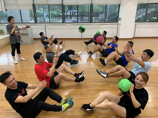 党支部书记黎荣结合自身的专业特长,通过热身跑、面对面交谈、运送重力球、打坐冥想等几个不同的体育小游戏,让教师党员们放松身心,投入到游戏中。在黎书记的指导下,教师党员们不分你我,积极配合,运用重力球完成了一系列简单的力量训练。通过近距离的交流,大家在身体和心灵上都获得了共鸣,空中不时传来欢声笑语。教师党员们纷纷表示这类党日活动既能与专业结合,又能锻炼身体,达到了增强合作凝聚力的效果。