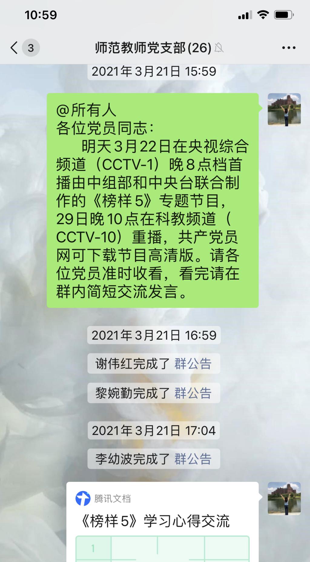 2021年3月22日晚8时,师范教师党支部全体党员以分散观看直播和在支部微信群线上交流的方式学习了由中央组织部和中央广播电视总台联合制作的《榜样5》专题节目。
