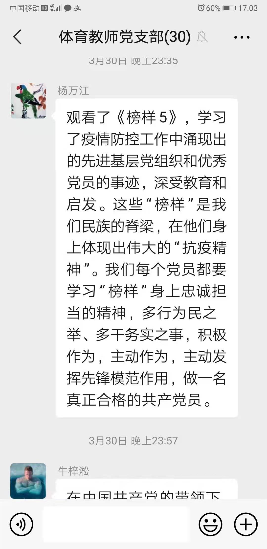 杨万江同志观看《榜样5》谈到:“学习了疫情防控工作中涌现出的先进基层党组织和优秀党员的事迹,深受教育和启发。这些榜样是我们民族的脊梁,在他们身上体现出伟大的抗疫精神。我们每个党员都要学习榜样身上忠诚担当的精神,多行为民之举、多干务实之事,积极作为,主动作为,主动发挥先锋模范作用,做一名真正合格的共产党员。赵全同志:“共产党员都应当具备坚定的信仰,高度的责任心和服务群众的真心”。刘宏宇同志:“《榜样5》观后让人激动奋进,在强国之路上需始终秉持人民至上的理念,在平凡的教学工作岗位上,挥洒汗水,锤炼品质,不忘初心”。党支部每一位党员同志都分享了观后体会。