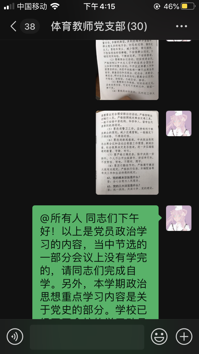 体育教师党支部通过此次活动帮助同志们提高党性修养,凝聚共识。学习党的历史,学习榜样的精神,了解我们的过去,了解优秀党员的伟大抗疫精神才能更好地看清前进的方向,明白脚下的路该怎么走。大家进一步认识到作为一名党员要始终保持优良的作风,保持共产党人的政治品格和道德操守。