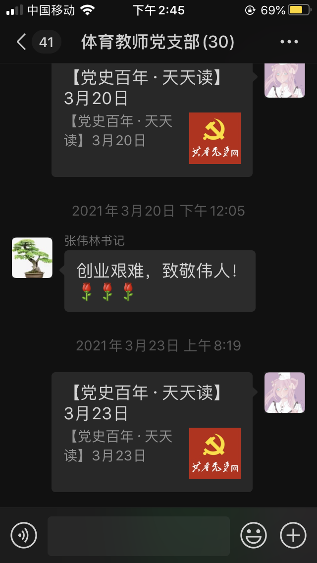 2021年3月11日至30日,体育教师党支部组织开展了《论中国共产党历史》的学习、党史百年天天读、“向新时代最美的抗疫勇士致敬—观看《榜样5》主题教育”党日活动的一系列学习活动。通过线上与线下相结合的方式,号召带领体育教师党支部全体党员同志学党史、知党恩、跟党走、向党的百年华诞献礼。