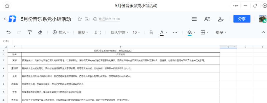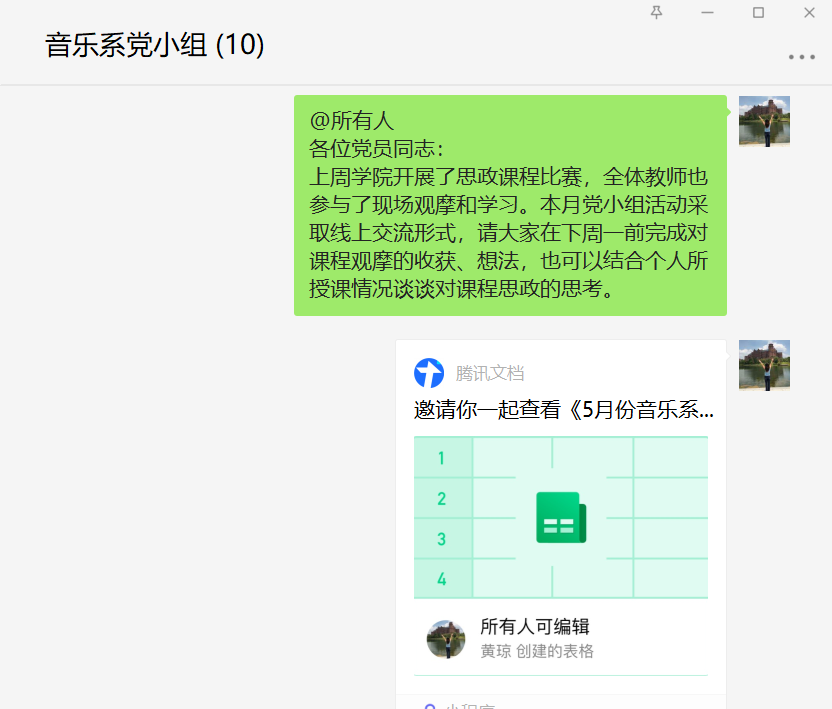 比赛结束后音乐党小组同志们通过党小组微信工作群发表了观摩学习心得,并结合自身教学工作实际展开了对思政元素融入课程的体会。