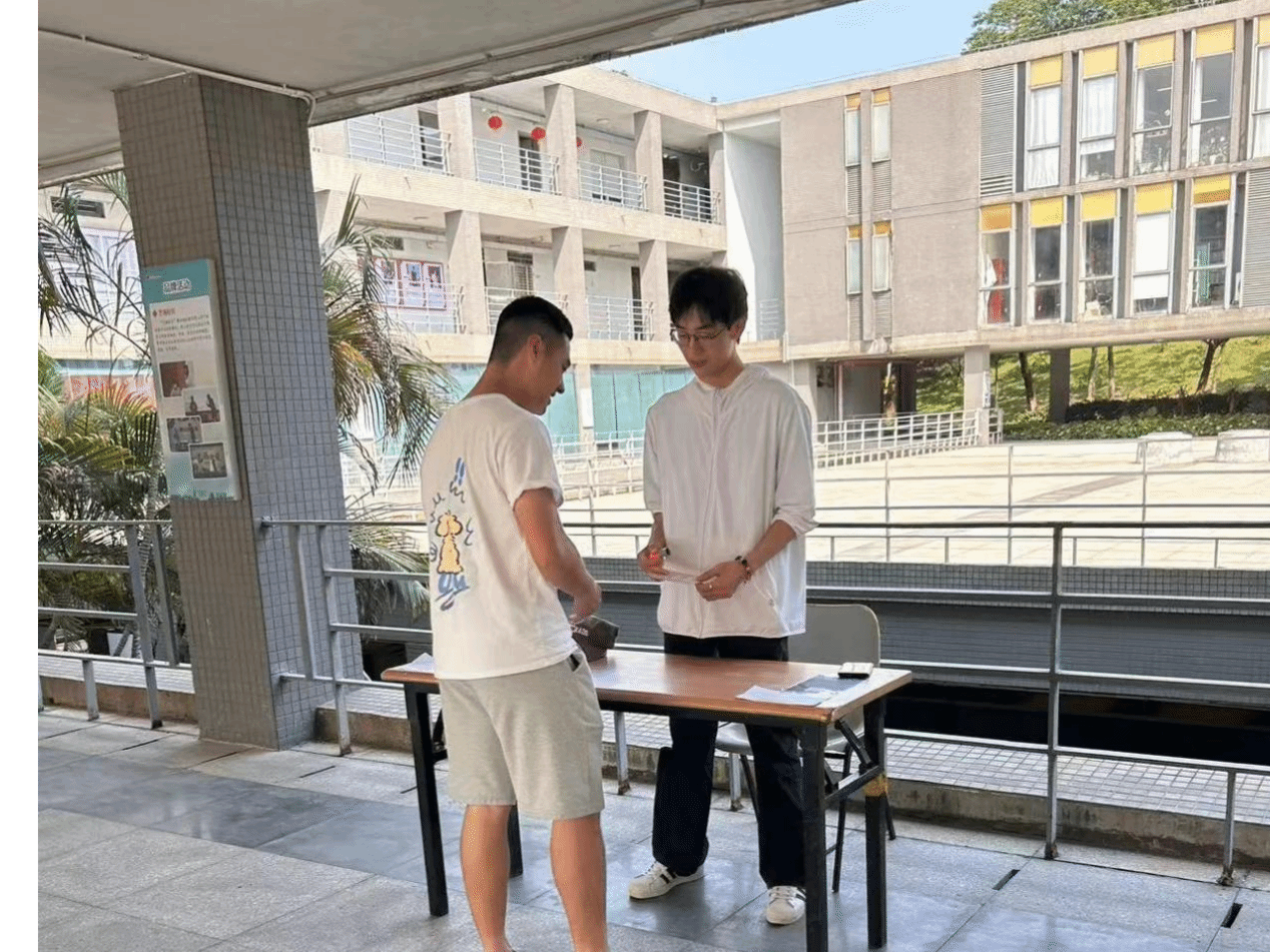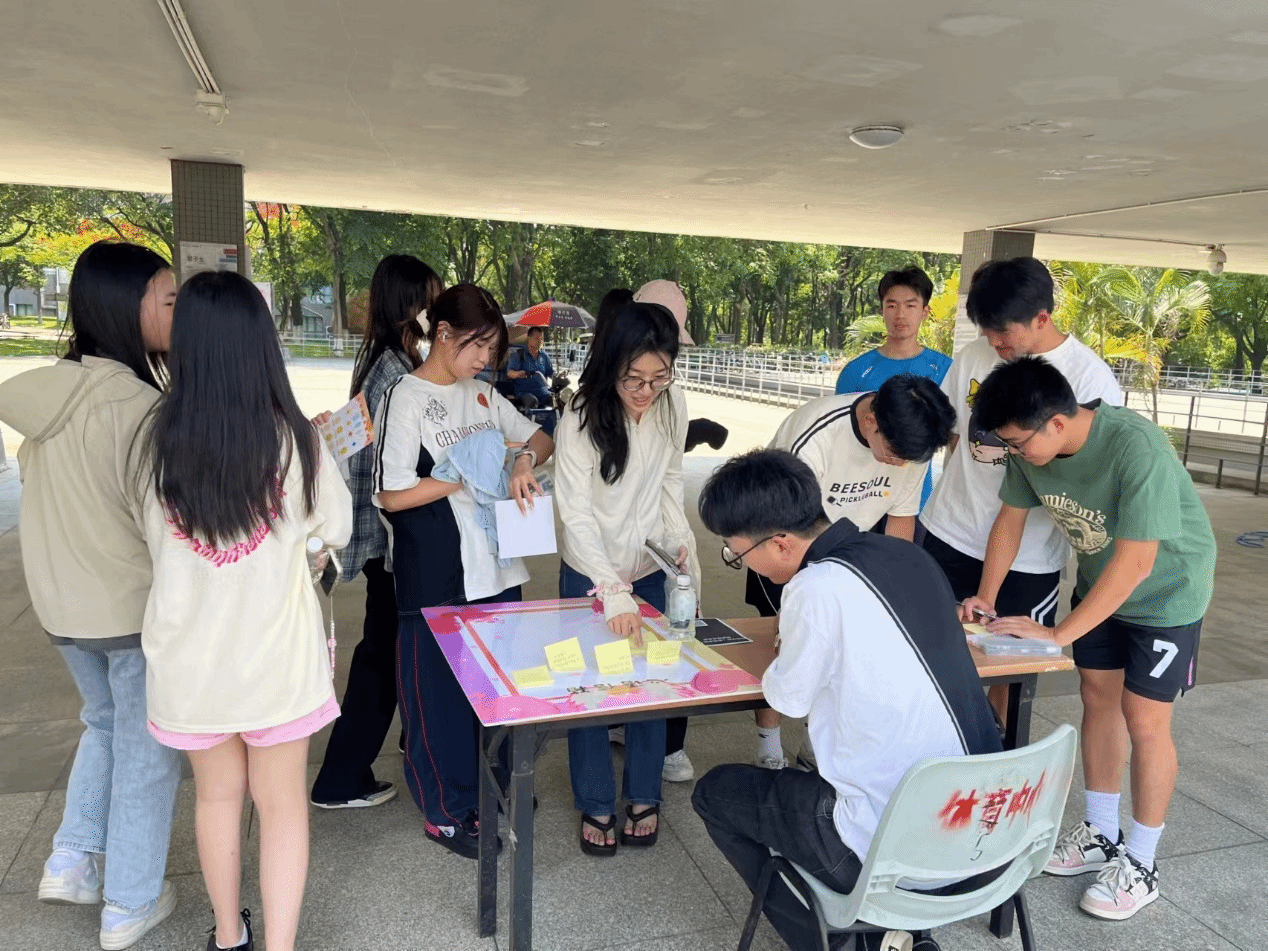 在“欢乐接力传球”打卡点,四人为一组,每人拿一张A4纸弯成凹槽使乒乓球连续滚动。同学们齐心协力,配合默契,现场氛围热烈。