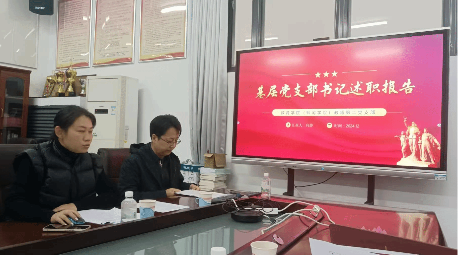 本次考核分现场述职和书面述职结合方式进行,教师第一党支部书记仲雷、教师第二党支部书记向静进行现场述职,员工第一党支部书记袁志军、员工第二党支部书记黄小万、员工第三党支部书记陈嘉倩进行书面述职。