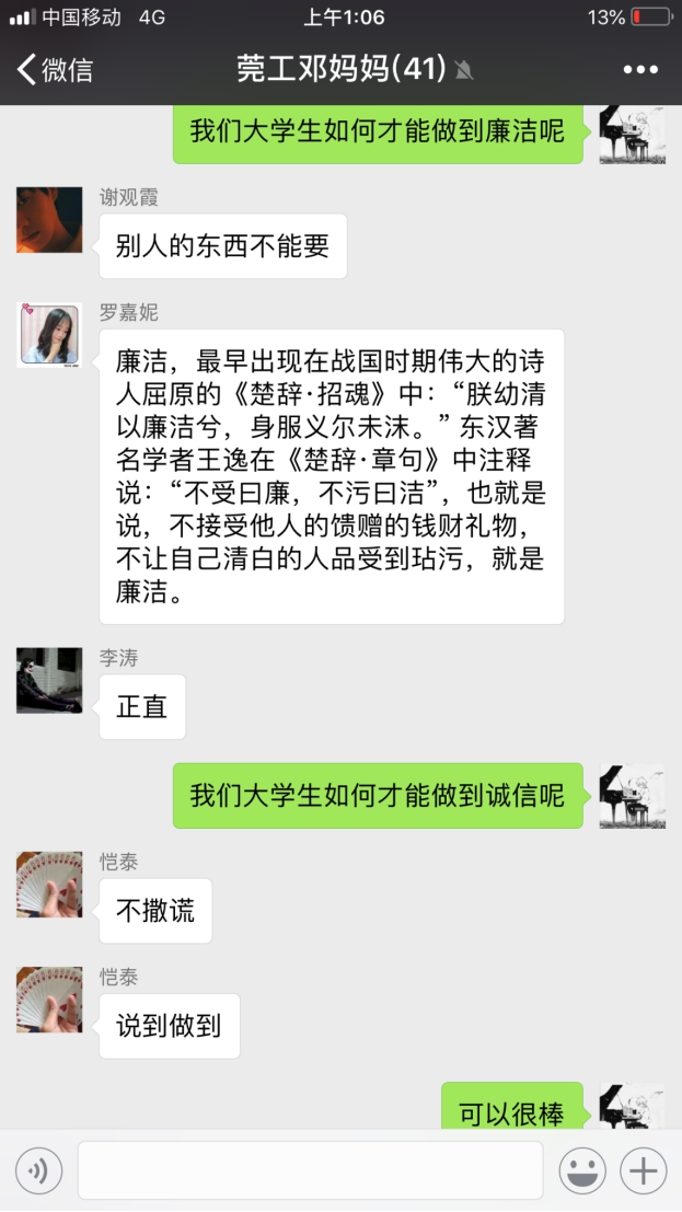 10月10-15日,伟德国际194616、17、18级开展“老员工廉洁诚信教育”活动,活动的目的在于贯彻落实新时代新作风、响应公司加强学风建设的号召,以班级带头行动,加强廉洁诚信教育,培养教育学子自律自强能力。各班积极参与此次活动,主题形式多样化,有开展廉洁诚信教育主题班会、观看《漫谈校园廉洁文化》、学习廉洁诗歌、承诺“我廉洁、我诚信”签名仪式、我的一句话等形式,学习有关老员工廉洁诚信的知识,丰富活动形式,以生动有趣的方式进一步加强廉洁诚信教育。