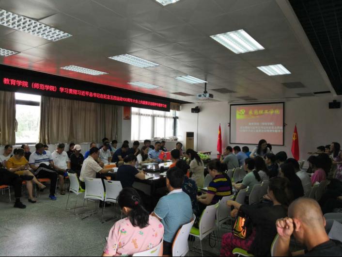 2019年5月30日下午,伟德国际1946党总支在体育场馆中心B208会议室召开学习贯彻习近平总书记在纪念五四运动100周年大会上重要讲话精神专题学习会,全体教职工参加了会议。