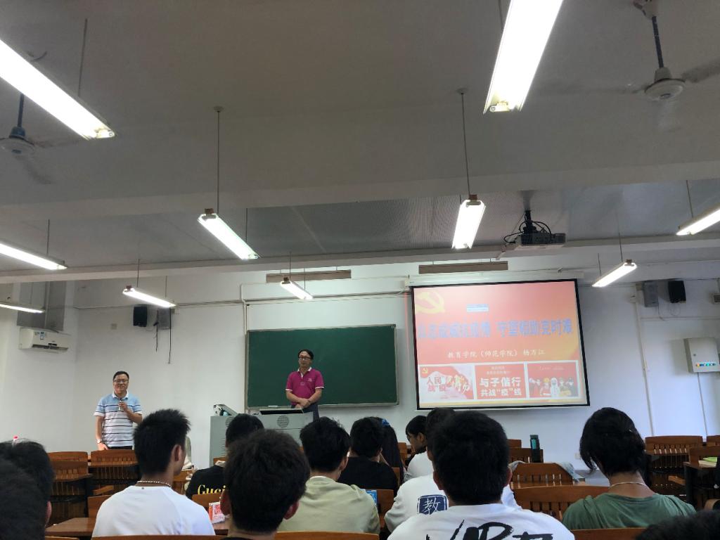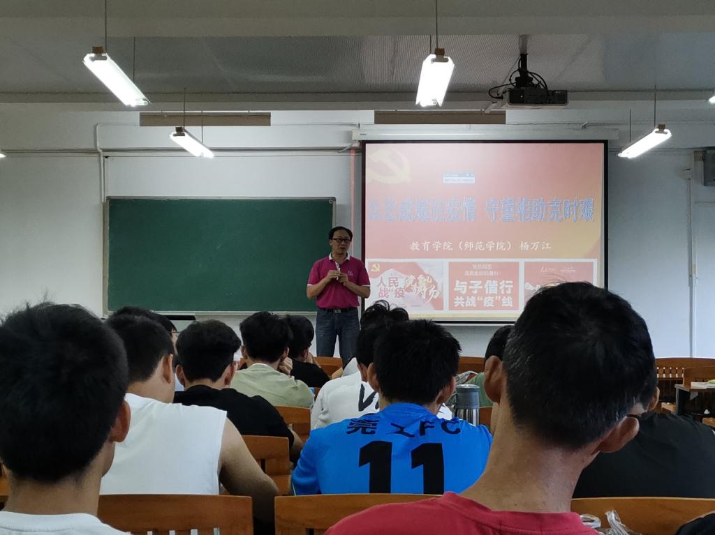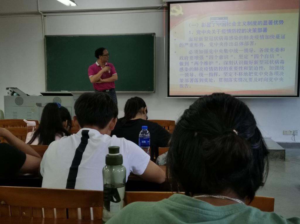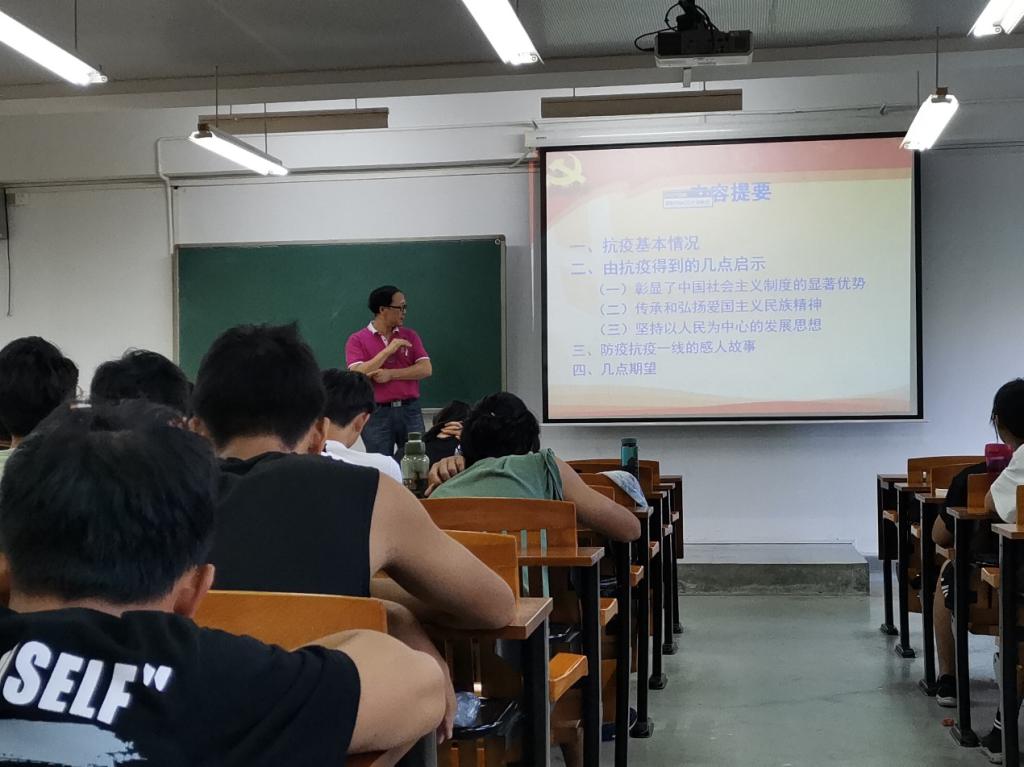 接着,杨书记以讲故事的方式为同学们讲述了发生在抗疫一线的动人事迹。最后,杨书记以三点期望作为本次课程的总结。第一点,要增强防控意识,积极抗击疫情,争当防控表率;第二点,涵养家国情怀,强化责任担当,奉献青春力量;第三点,遵守校园规范,按时健康打卡。