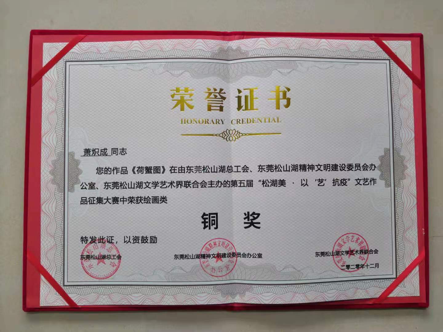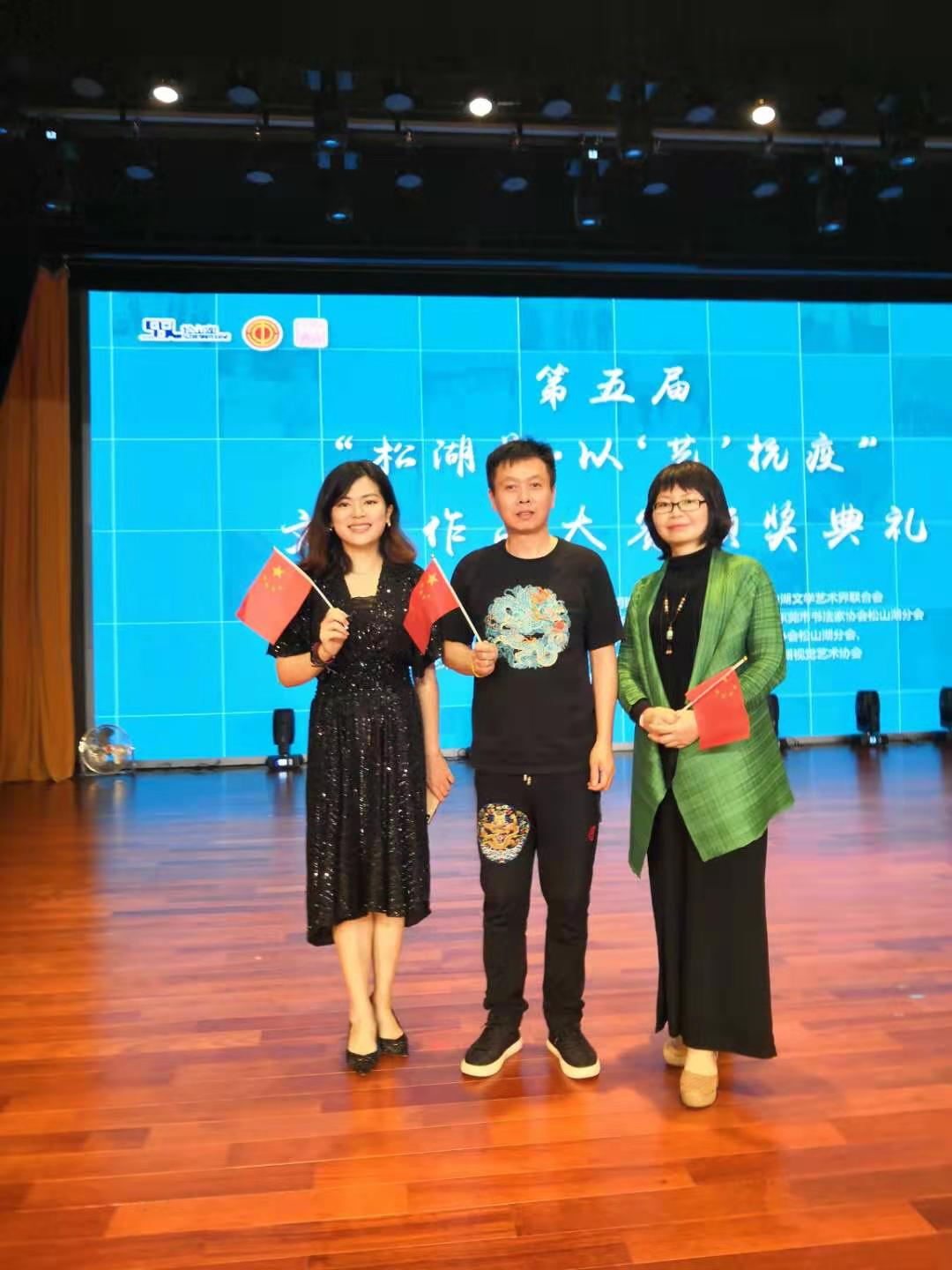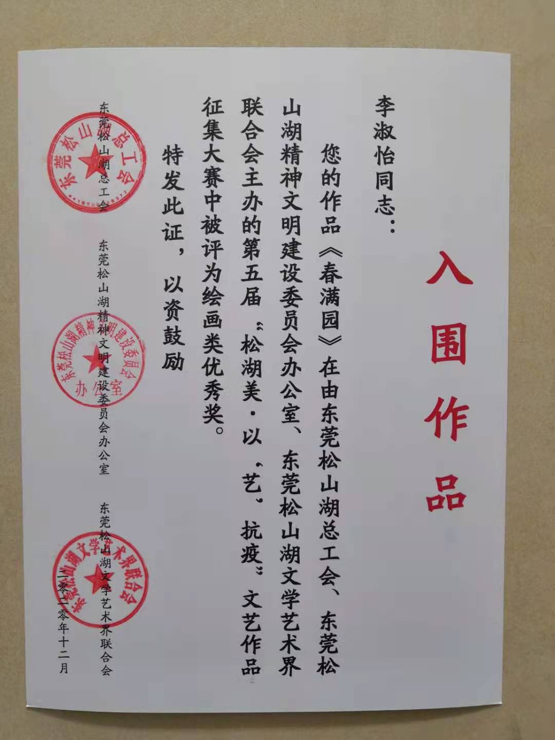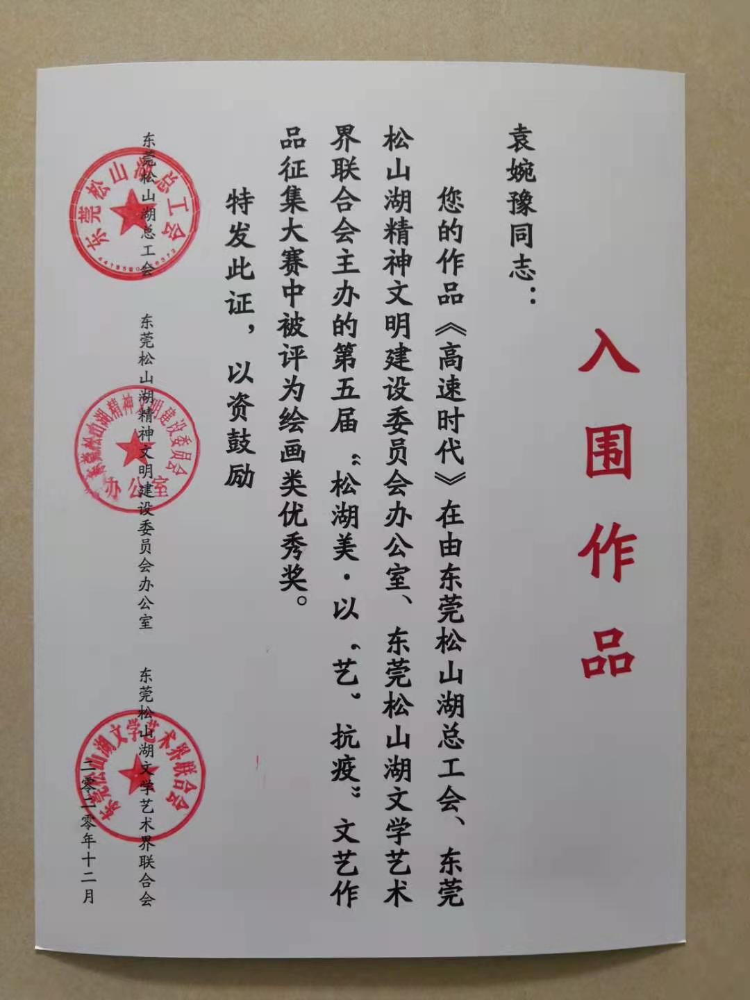 2021年4月11日上午,第五届松湖美·以“艺”抗疫文艺作品大赛颁奖典礼在松山湖青少年活动中心举行。伟德国际1946师生在大赛中荣获多个奖项,分别是:李淑怡老师的《老家》和《春满园》分别获美术类金奖和优秀奖,萧炽成老师的《荷蟹图》获铜奖,袁婉豫同学的《高速时代》获优秀奖。杨万江老师的《英雄儿女》获朗诵类铜奖。