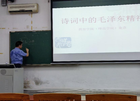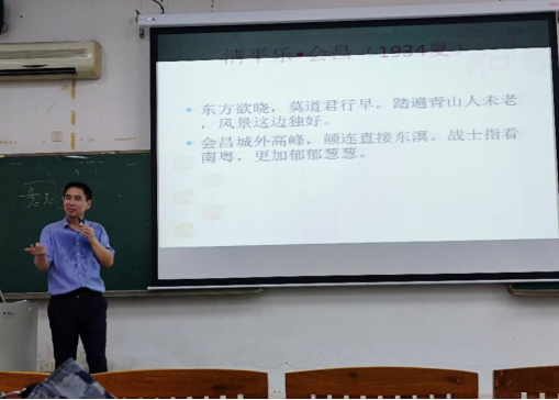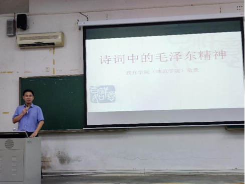 课上,余意经理首先以精卫填海、夸父逐日等寓言故事告诉同学们要树立远大目标,并表示我们都有属于自己的海需要填,有自己的太阳需要我们去追,要明确自身当前与未来的定位。其后,余意经理通过回溯中国共产党的历史讲述了建党之初的艰辛历程,他嘱咐同学们,一代人有一代人的使命,我们作为新时代的年轻人就要肩负起新时代赋予我们的使命。而后,余意经理给同学们介绍了毛泽东的诗词如《沁园春•长沙》《清平乐•会昌》《七律•长征》等,并提及每一首诗词都体现了毛泽东同志的自由意志和积极乐观的革命精神,强调毛泽东同志在写每一首诗词时,红军都经历着不同程度的困难,但在诗词中,体现的是毛泽东同志豪迈的气魄以及对革命道路取得胜利的必胜决心。