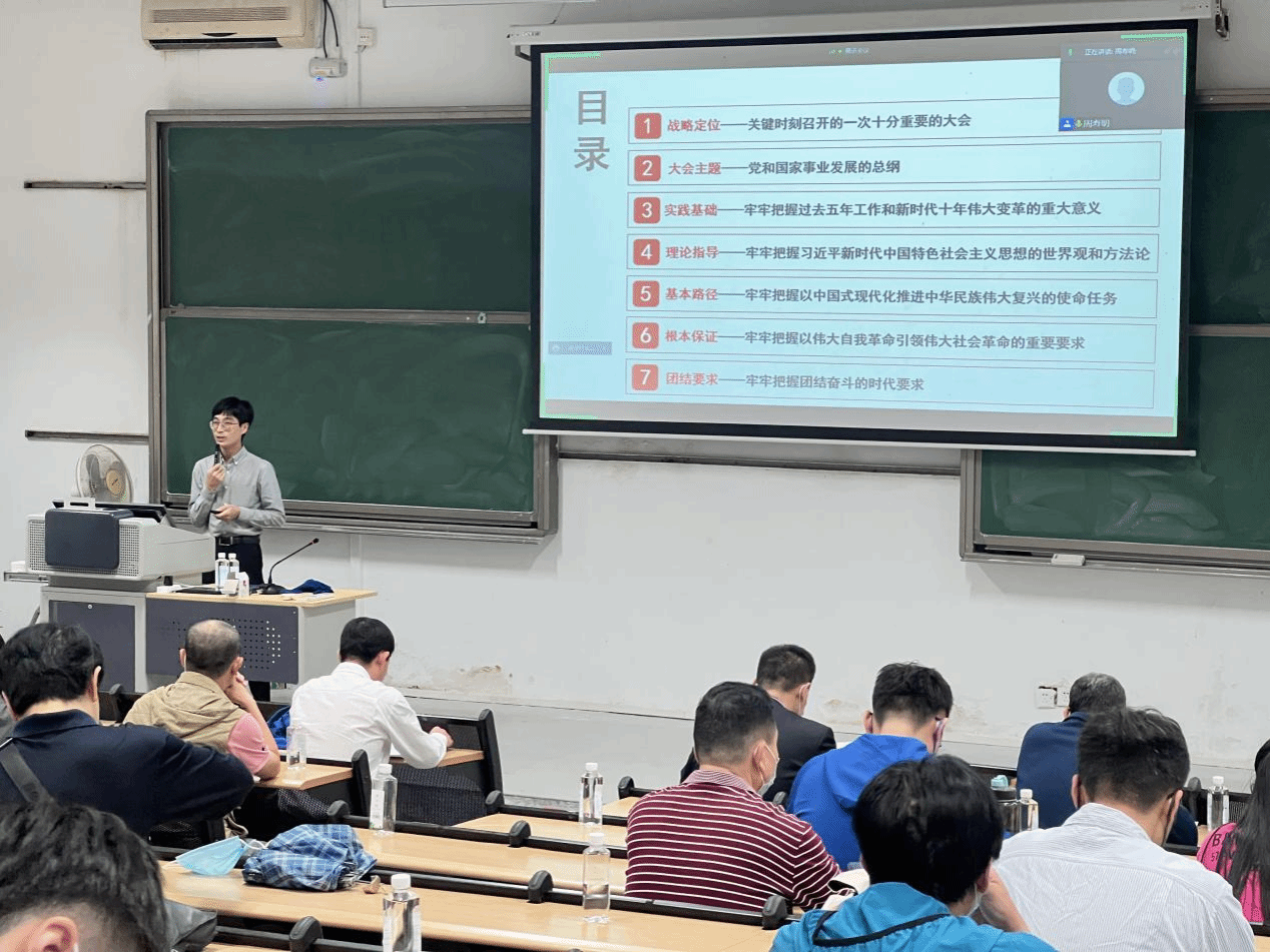 李宏博士围绕党的二十大报告十五个部分,从大会主题、战略定位、实践基础、理论指导、基本路径、根本保证、团结要求七个方面进行了详细讲述。李宏博士指出马克思主义是我们立党立国的根本指导思想,党的二十大报告明确了我们党要全面贯彻习近平新时代中国特色社会主义思想,弘扬伟大建党精神,自信自强、守正创新,踔厉奋发、勇毅前行,为全面建设社会主义现代化国家、全面推进中华民族伟大复兴而团结奋斗。